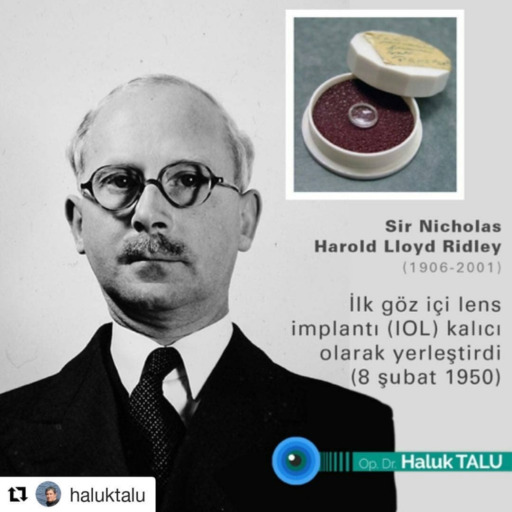 İkinci dünya savaşı sırasında askeri göz doktoru olarak çalışan Herold Ridley, kokpit camlarından kopan parçaların kaza sonucu pilotların gözlerine saplandığında gözde reaksiyon oluşmadığını fark eder ve akrilik plastikten yapılı göz içi lensi fikrini oluşturur. İlk göz içi lens operasyonunu 1950’de Londra’da gerçekleştirir. Tıp dünyasında büyük tepkiyle karşılanmasına rağmen lensleri ve tekniğini yıllar içinde geliştiren Ridley, katarakt ameliyatı olan hastaları afak gözlüklerinden kurtarabilmeyi başarmıştır. #DrHalukTalu #dünyagözataköy #gözdoktoru #katarakt #kataraktcerrahisi #tıptarihi #göziçilens #IOL #cataracts #SirNicholasHaroldLlyodRidley #historyofmedicine